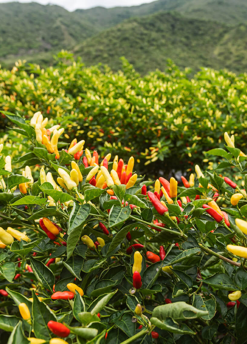 Nuestros cultivos están localizados en el Valle de Cauca, Colombia, bañados por el sol y por sus abundantes aguas cristalinas de los ríos Andinos. El suelo colombiano produce una amplia gama de ajíes como Cayena, Jalapeños, Habaneros, Scotch Bonnet, Ghost Peppers (Jolokia) y nuestro Amazon Pepper, que cultivamos durante todo el año, y que hemos tenido desde 1974.