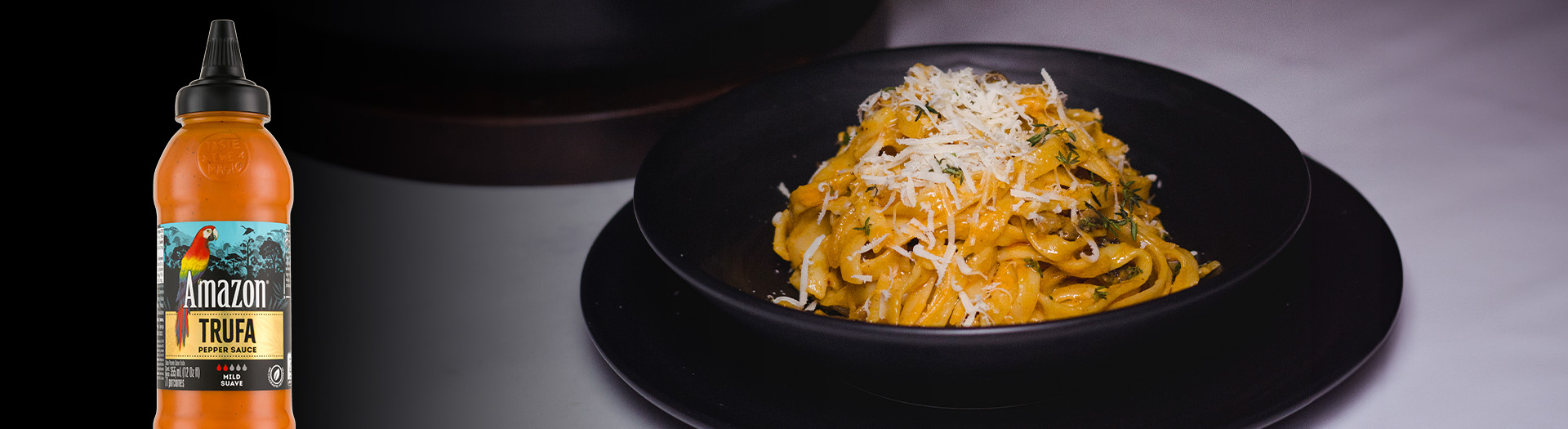 Agrega salsa Trufa Amazon al gusto, luego adiciona la crema de leche y revuelve. Adiciona el agua de la pasta que reservaste anteriormente y mezcla hasta que todo se haya integrado. La salsa debe estar cremosa y espesa.
